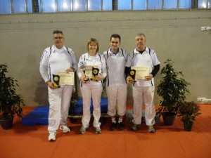 L’EQUIPE POULIES REMPORTE POUR LA DEUXIEME ANNEE CONSECUTIVE LA COUPE D’AUVERGNE. Les 25 et 26 janvier 2014 se déroulait à Riom la Coupe d’Auvergne par équipes de club. Le club des Archers Dompierrois a présenté une équipe poulies et deux équipes hommes et femmes classiques.